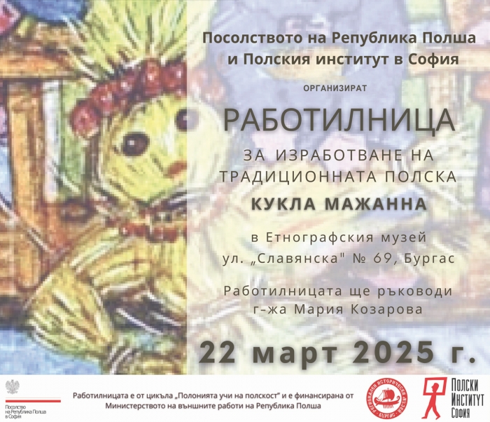 На 22.03.2025 година (събота) от 11:00 и 14:00 часа в Етнографската експозиция на РИМ Бургас на ул. „Славянска“ 69 ще се проведат работилници, посветени на изготвяне на традиционната полска кукла „Мажанна“. Събитието, част от цикъла „Полонията учи на полскост”, се организира от Посолството на Република Полша и Полския институт в град София и на него ще присъства г-жа Малгожата Хейдук-Громек, консул на Република Полша в България.