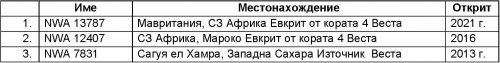 Тези метеорити са ахондрити и са с доказан източник астероида Веста. Немерени са от местни търсачи на метеорити в СЗ Африка.