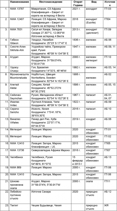 Колекцията съдържа метеорити от Швеция, Чехия, Русия, Китай, Бразилия, Куба, Чили, Мавритания, Намибия, Мароко, Кения. Представени са основните типове метеорити – каменни (хондрити и ахондрити), каменно-железни (паласити) и железни. Три метеорита са с доказан източник астероид Веста.