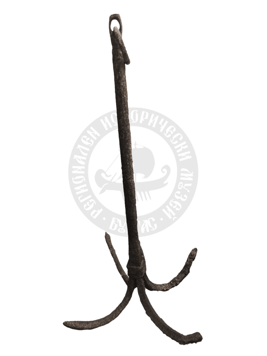 Description: Котва - аламанджийска от желязо, с 4 шипа и желязна халка в горния край, силно окислена