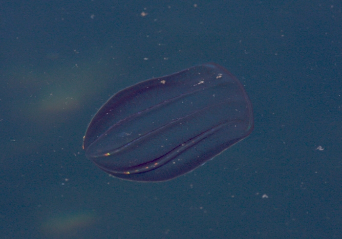 This is Beroe ovata - a representative of the genus Ctenophora (commonly known as comb jellies). These are single, free-living marine organisms with transparent body, planktonic species. Their body grows to 16 cm, has cylindrical shape and like the jellyfish is made of two layers of cells (ecto and endoderm). Between these layers there is non-cellular (non-living) tissue called Mesoglea. Unlike other comb jellies it is coloured in pale pink-yellow. The main organs of locomotion are eight longitudinal rows of cilia, which form the "combs" and gave the name of the species. They beat synchronously in the water and act like oars. Beroe ovata prefers warm, calm waters, during wind waves sink deep. The species move in groups. At night they emit bright cold light due to the absorbed luminous bacteria.