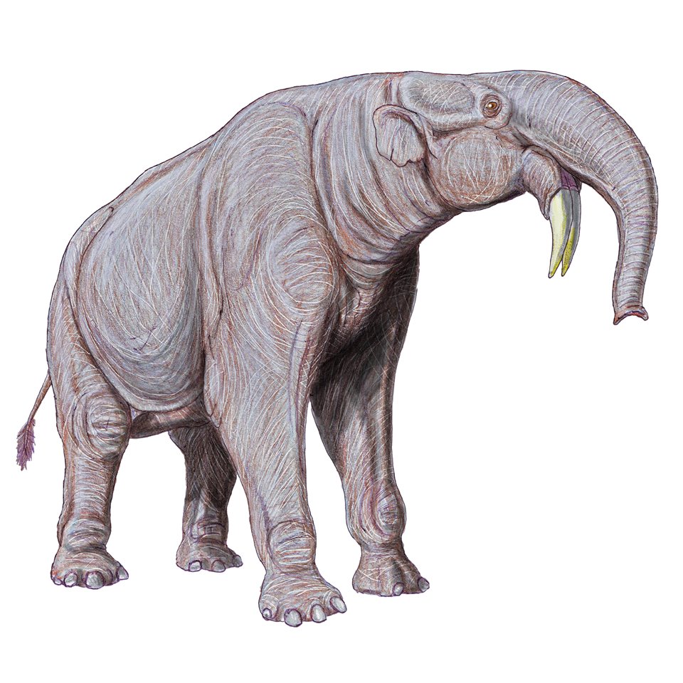 Deinotherium originated from the Prodeinotherium, an animal that was a bit smaller and lived 18 to 10 million years ago in Africa. Deinotheriums lived in the late Miocene and early Pliocene. They disappeared at the end of the last ice age. Other extinct proboscideans, similar to the Deinotherium are Amebelodons, Stegolophodons, and many others. Probable cause for their extinction is climate change.
