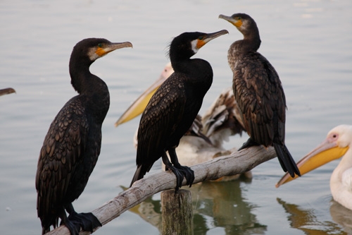 The Great Cormorant is a fish-eating bird. Hunt singly or in small groups as it dives and can stay under water more than a minute. Often the cormorant becomes a victim at fishing ponds because people believed that it causes great damage and pursue it relentlessly. When its feathers get wet, you can see this large bird resting or drying with outstretched wings on the trees or poles of power lines. The Great Cormorant flies with slow, powerful strokes of the wings and their flocks are wedged.
