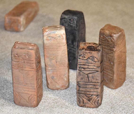 A creative ceramic replica, handcrafted with tools and technologies analogous to prehistoric practice. It depicts a ceramic prism of a Chalcolithic (Stone-Copper Age) female deity, symbolizing the stability and unity of the settlement.