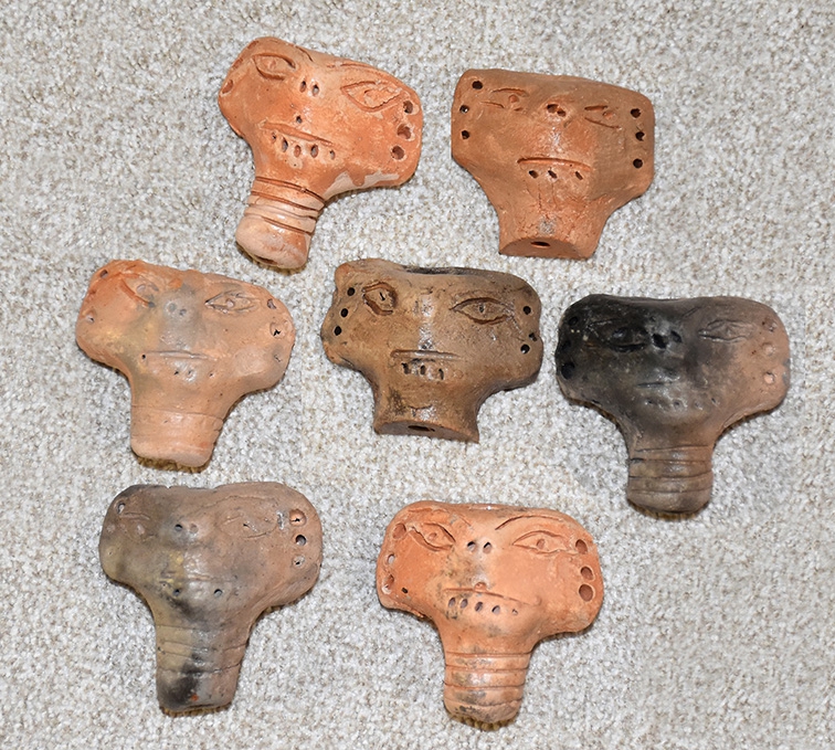 A creative ceramic replica, handcrafted with tools and technologies analogous to prehistoric practice. It features a ceramic head of a Chalcolithic (Stone-Copper Age) goddess, patroness of fauna and domestic animals.